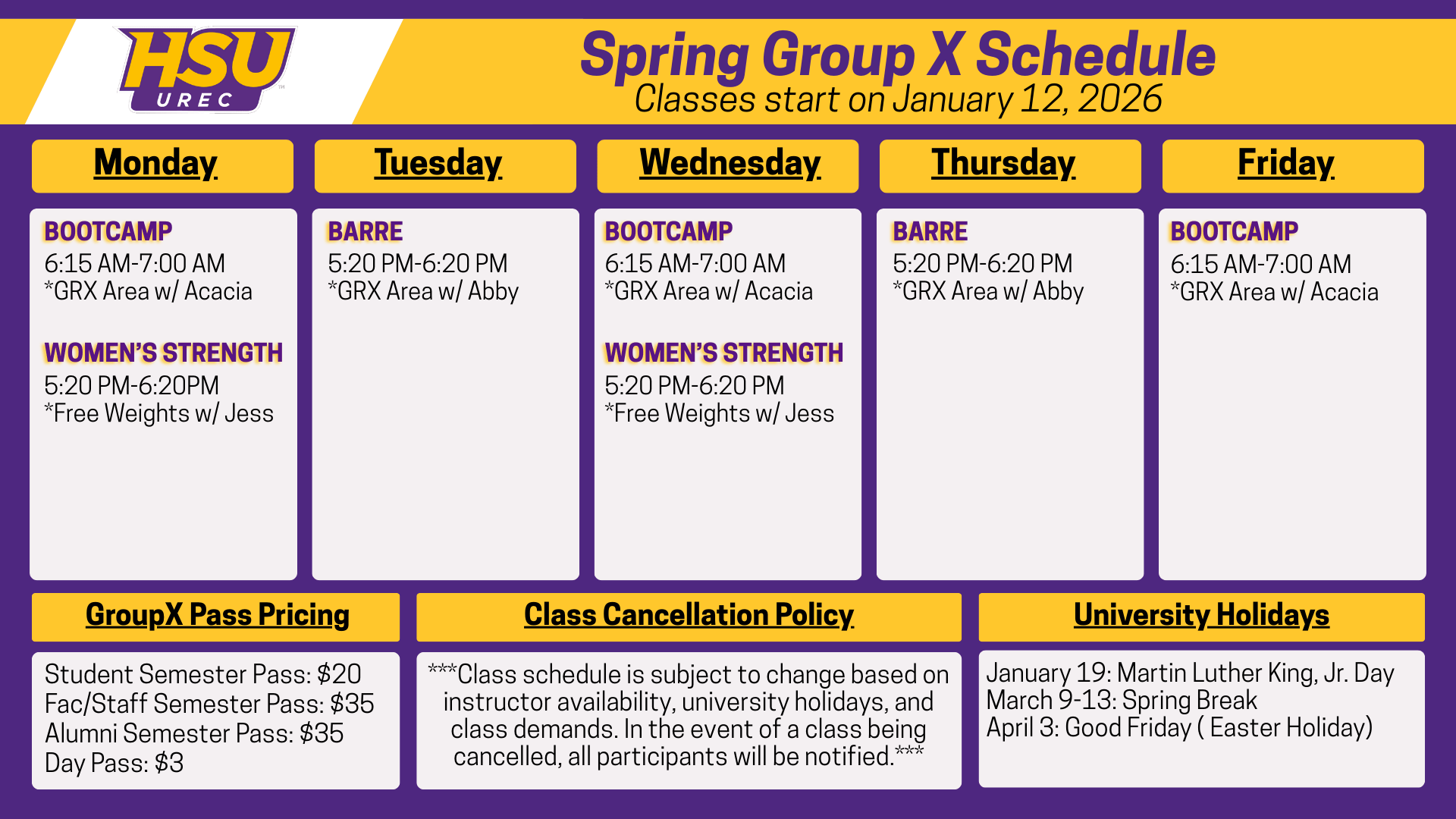 - All group exercise classes are subject to cancellation for University Holidays, emergencies, and weather restrictions. An email will be sent to all group exercise participants on cancellations.